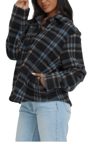 Billabong's Breezy Sweatshirt Shacket brings cozy style with printed polyester sherpa and a relaxed boxy fit. Button up, slip something in the side pockets, and head out looking perfectly put-together.
