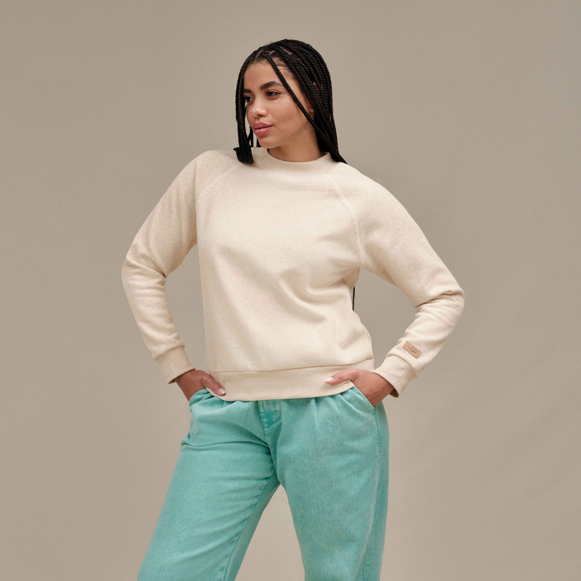 - The UGG® License Plate leather label on wearer's left sleeve